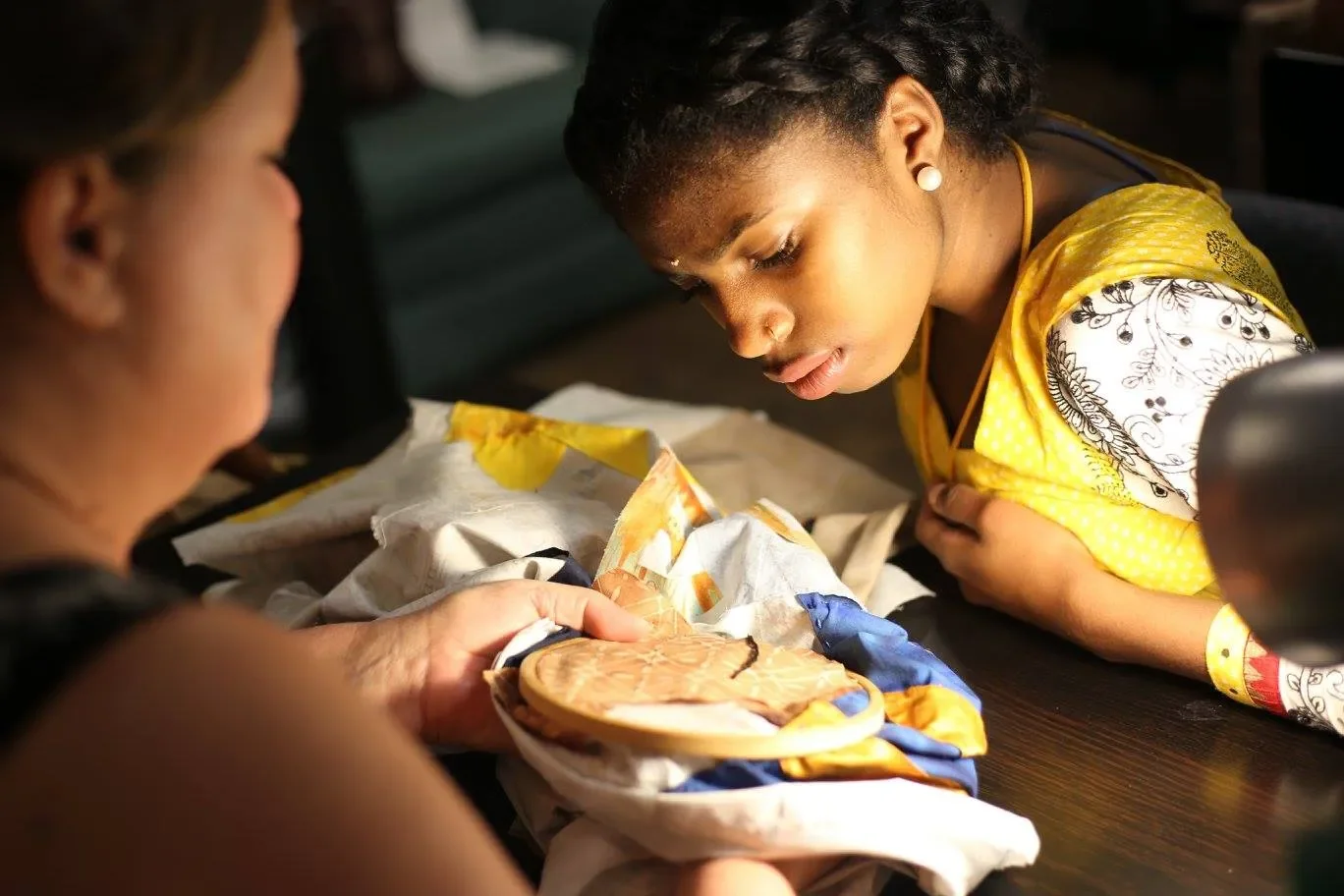 For this assignment, each student started by drawing a sketch of the tote bag they wished to make, and then worked to create that using a sewing machine. This image is a placeholder from this site: https://www.reddit.com/r/printmaking/comments/1eu7x8t/actually_trying_lino_blocks_on_totes/